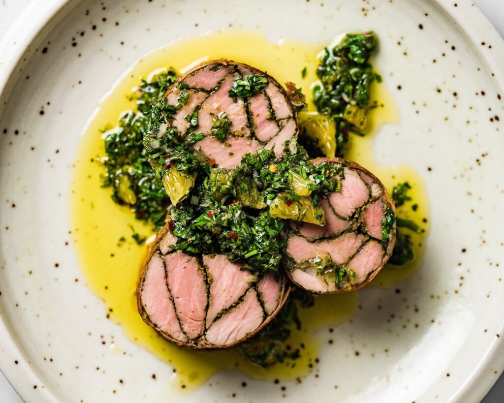 - Meanwhile, make the sauce: Finely chop the parsley, thyme, shallot, and garlic and transfer to a medium bowl. Segment and dice the orange, then add it to the bowl. Stir in the olive oil, vinegar, pepper flakes, salt, and pepper.