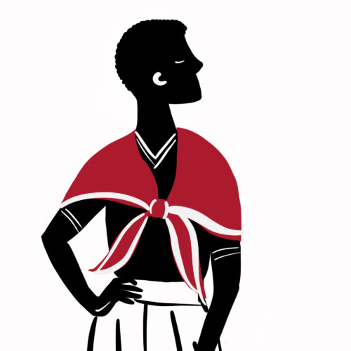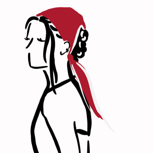 - Use the ends to tie a knot beneath the chin and shift the scarf to either side. Make a second knot leaving the loose strands to hang and voilà!