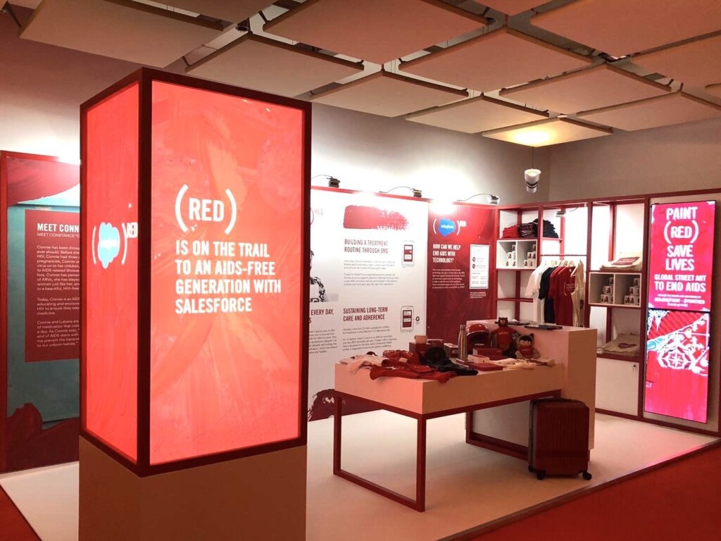 In Lyon, Salesforce and (RED) had a joint booth at the Palais de Congrès (AKA where the Replenishment conference was held). Tons of Replenishment Conference attendees stopped by to hear Connie and Lubona’s story and learn about the role technology plays in accelerating the fight to end AIDS. The booth also featured a (PRODUCT)RED display with an array of products from (RED) partners and a dedicated section about the PAINT (RED) SAVE LIVES campaign. PAINT (RED) SAVE LIVES merchandise was available for sale, with proceeds going directly to the Global Fund.
