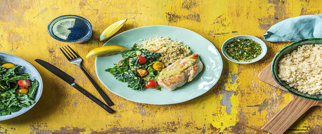 - 6. Finish and Serve. Fluff couscous with a fork, then season with salt, pepper, and lemon juice (to taste). Add tomatoes and 1 TBSP dressing to kale and toss to combine. Divide couscous, kale mixture, and chicken between plates. Spoon remaining dressing over everything and serve with chimichurri and lemon wedges on the side for dipping and drizzling.
